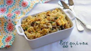 - Now add cooked quinoa and chopped coriander/ cilantro to the scrambled egg mixture. Mix well. Check for salt. When everything looks combined switch off the flame and serve it hot.