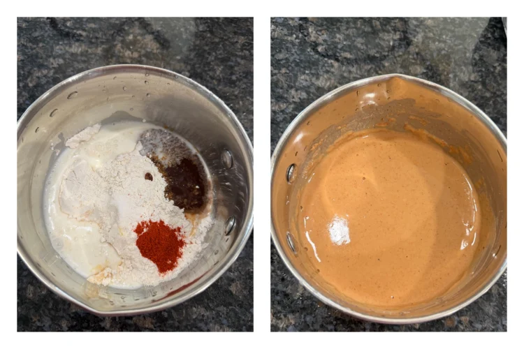 In a bowl, whisk together flour, milk, BBQ sauce, paprika, garlic powder, and salt until you get a smooth, thick coating consistency.