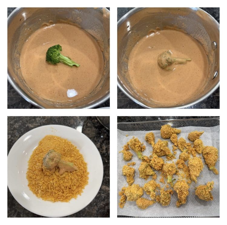 Dip each broccoli piece in the batter, then roll it in the crumbs until perfectly coated. Place the coated broccoli in the air fryer basket.