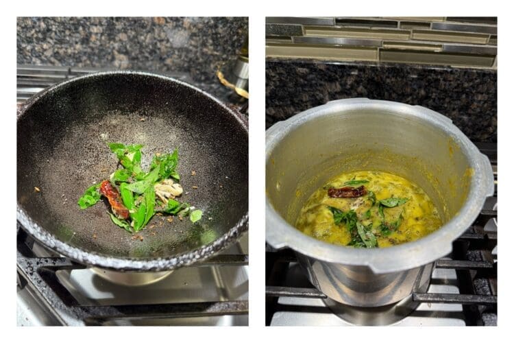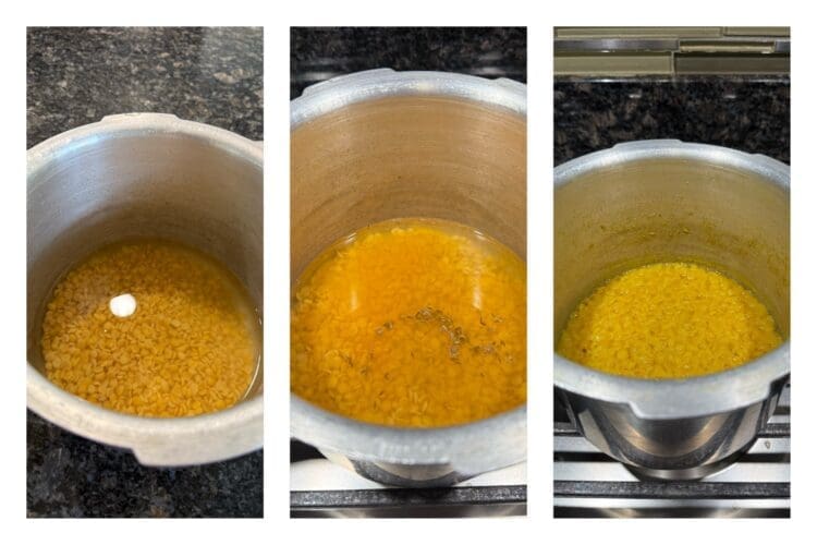 Wash toor dal and add it to a pressure cooker with turmeric, salt, few jeera and water. Pressure cook for 3–4 whistles until soft and mashable.
