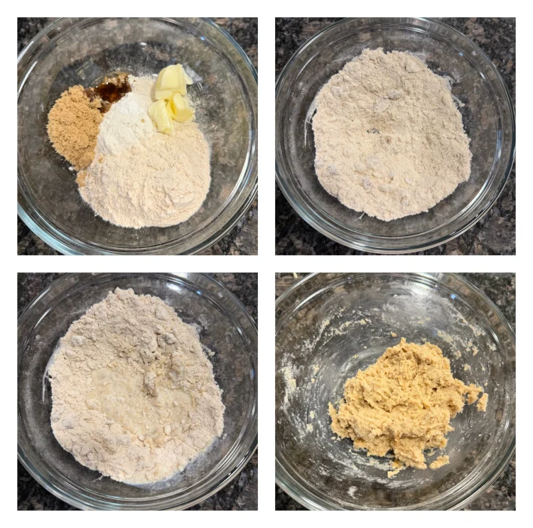 Rub in the cold butter until crumbly. Add the milk + vanilla.