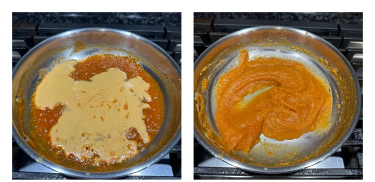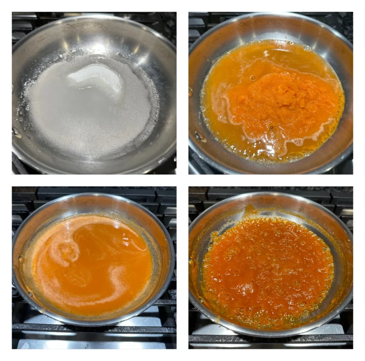 In a heavy-bottomed pan, add sugar and water. Once the sugar dissolves, add the carrot puree.