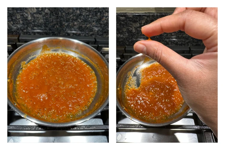 Stir continuously and cook on medium flame until the syrup turns glossy. - 1 string consistency