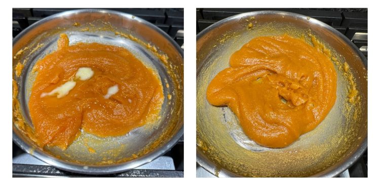Mix the roasted flour with a few spoons of melted ghee to make a smooth paste. Keep aside. - Make sugar syrup with carrot puree