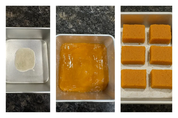 You’ll notice the ghee starts to separate slightly and the mixture turns silky. - Set the Mysore Pak
