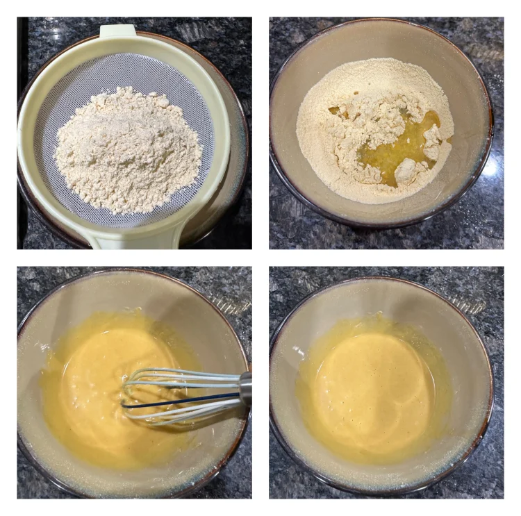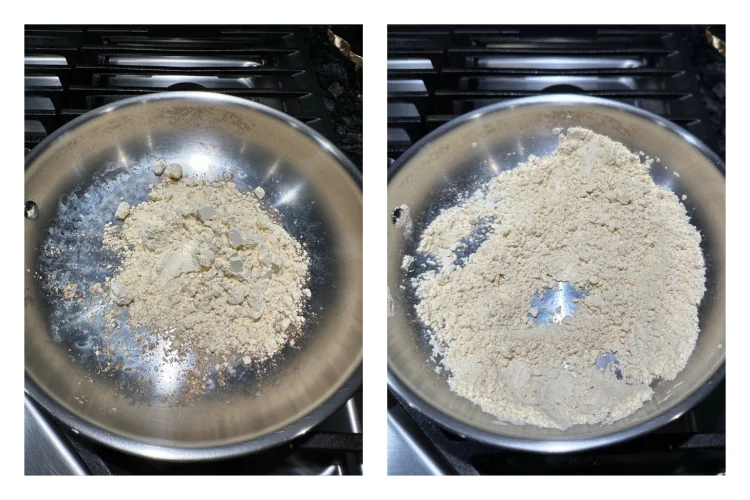 Heat 2 tbsp ghee in a pan. Add gram flour (besan) and roast on low flame until it turns aromatic and slightly golden. - Prep the Besan
