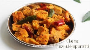 Yam mezhukkupuratti/ Chena mezhukkupurati is a very easy and quick to make Kerala style stir fry prepared by roasting yam/ chena along with some masala, onions and chili in coconut oil. This stir fry dish is a common side dish during lunch and it also holds a place in “Onam Sadya”. If you have been following my blog regularly then you would know that this post is a continuity of the onam series and all the other recipes are below: