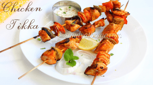 - Now arrange the skewers on the foil placed on the baking tray. Add 2 tbsp oil over every skewer with chicken and veggies. Now bake the chicken for 35 – 40 minutes. I flipped it once and you can see the final result was little charred one just as the restaurant which actually brings all the flavors to the chicken. When the chicken has achieved desired levels of cooking take the tray out and serve it hot !