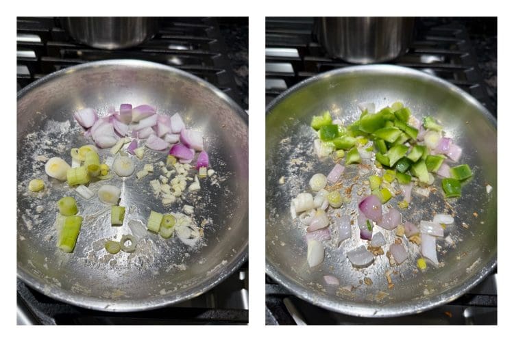 Heat 2 tsp oil in the same small pan. Add chopped ginger and garlic, and sauté until fragrant. Add onion cubes, green chilli, spring onions (white part), and green capsicum.