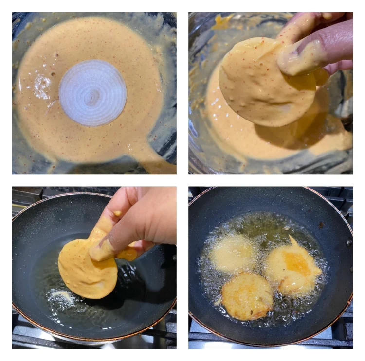 Heat oil in a pan. Dip each onion slice into the batter to coat evenly. Gently slide into hot oil and fry on medium heat until golden and crisp.