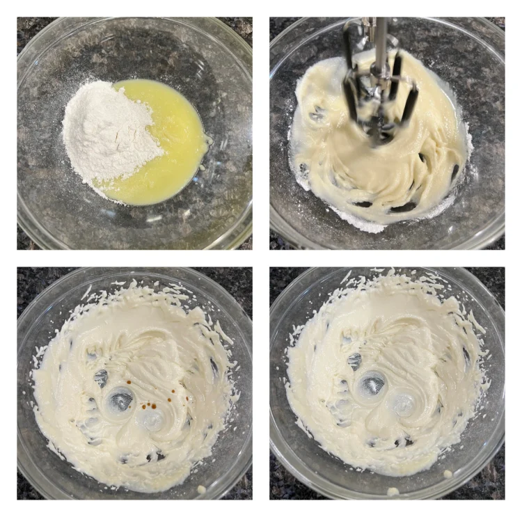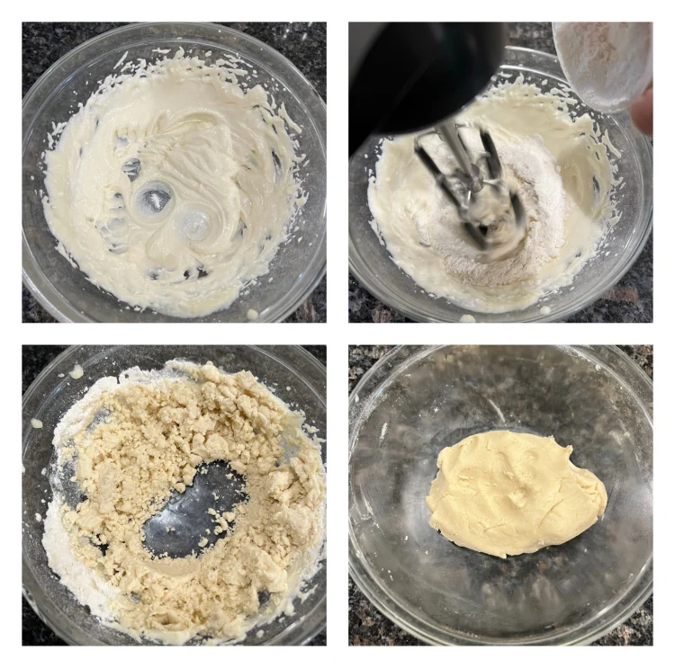 Preheat oven at 160–170°C (320–340°F). Add ghee and powdered sugar to a mixing bowl.