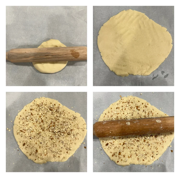 Roll it out gently into a thick circle (½–¾ cm thickness). Sprinkle chopped almonds evenly on top.