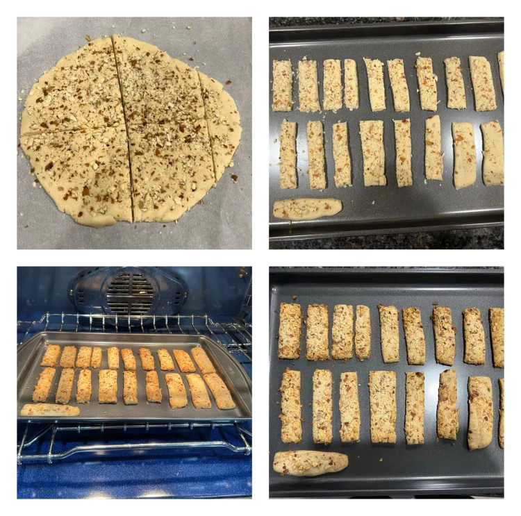 Cut the rolled dough into long strips like bakery cookie sticks and place them on a baking tray. Bake in a preheated oven at 160–170°C (320–340°F) for 12–16 minutes, or until the edges turn light golden. Let the cookies cool completely on a rack — they will turn perfectly crisp as they cool. Serve with milk, coffee, or chai and enjoy!