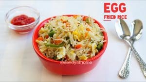 - Now heat oil in another pan , break eggs, to it add little salt and pepper powder. Scramble eggs well. When the eggs look scrambled add the veg fried rice and toss well. Switch off the flame and garnish with few chopped green stalks of spring onion. Serve it hot with ketchup or Manchurian !