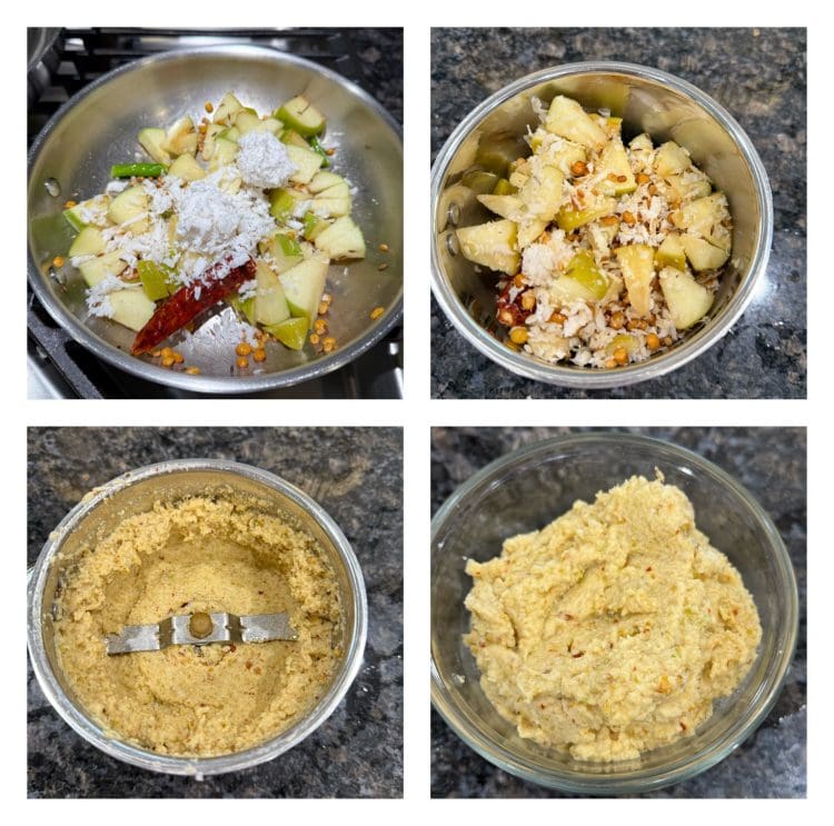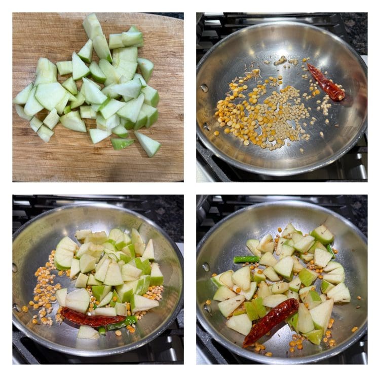 - Heat 1 tsp oil, roast urad dal till golden. Add green chilies, red chili, and curry leaves. Fry until aromatic. Add chopped green apple and saute for 2 to 3 minutes. Cool The mixture.
