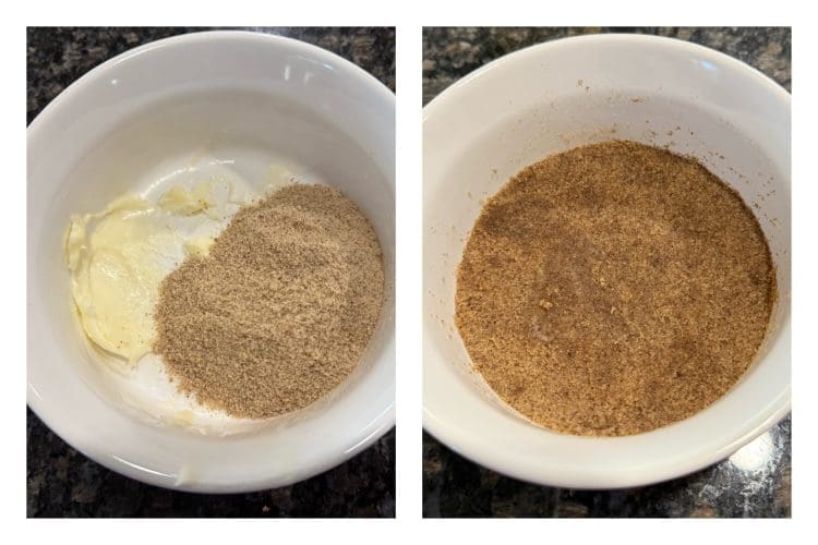 Combine cookie crumbs with softened butter. Mix until the texture resembles wet sand. Press the cookie crumb mixture into a greased ramekin to form the base.
