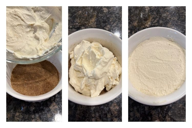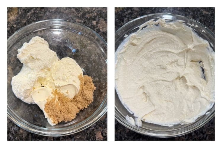 In a large mixing bowl, add strained ricotta cheese, mascarpone, vanilla syrup and brown sugar. Blend until smooth and creamy.