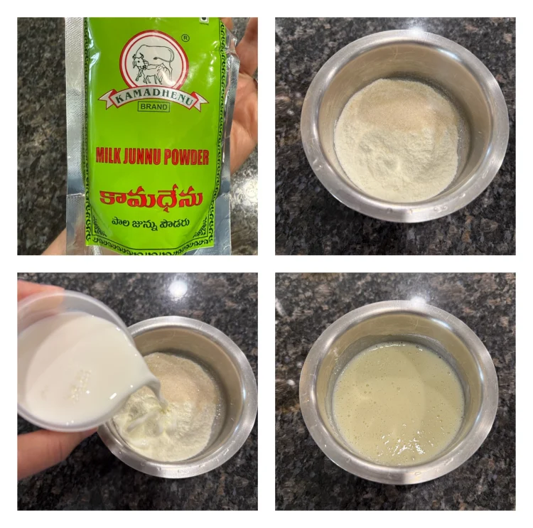 A: Simply combine the instant junnu/ kharvas powder with raw milk and sugar, steam it for 20–25 minutes, and chill. Many Indian grocery stores in the U.S. carry ready-made Junnu or Kharvas powder packets.