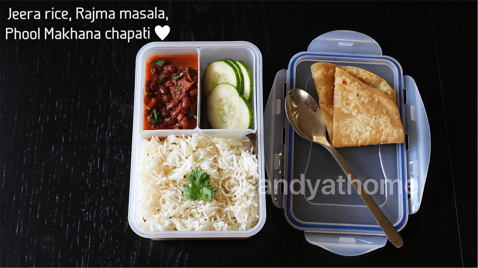 - While the was cooking I chopped onion and tomato for rajma masala. I made the dough too at that time. While the rajma masala was in pressure cooker I made roti. So everything was done in 30 minutes. I sliced cucumber too to go with it as it was a sunny day. Hope you liked this simple lunch box idea!!