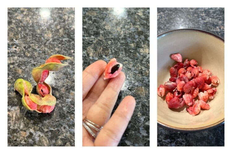 Crack open konakka pods, remove the soft arils, and discard the seeds and skin. Set aside the ripe (red) pulp.
