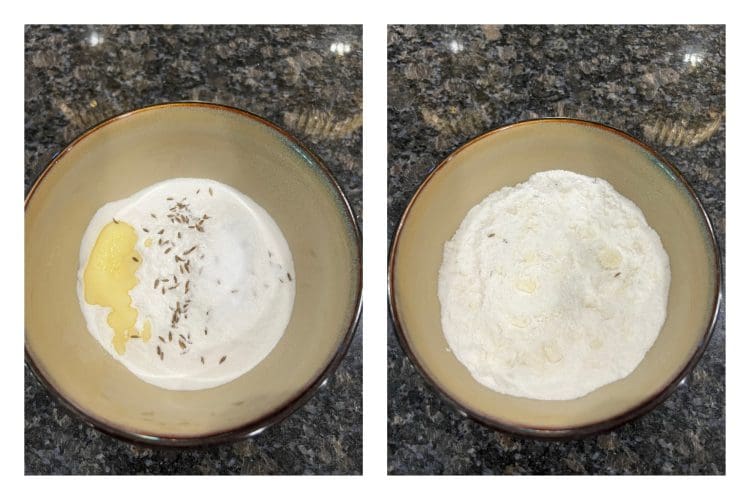 In a bowl, combine rice flour, salt, cumin seeds, and melted ghee.