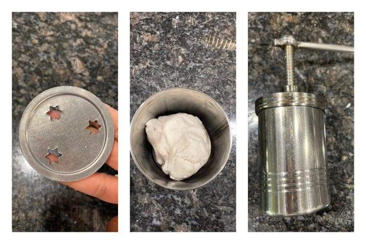 Grease the inside of the press with few drops of oil and fill it with the dough. - Deep Fry