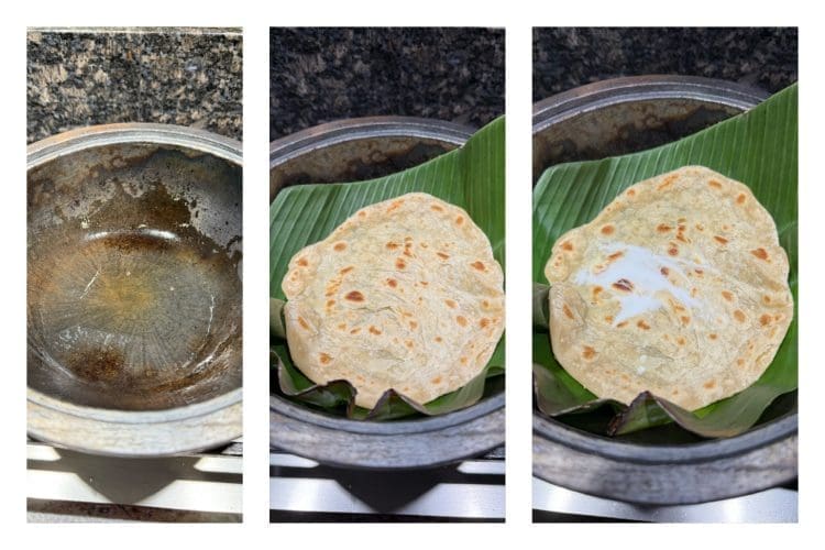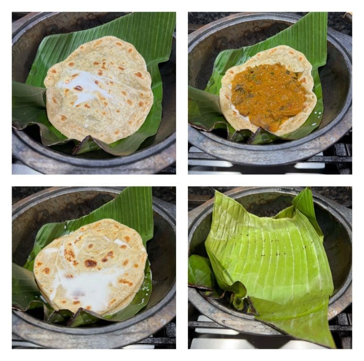 Brush the bottom of a small clay pot with ghee and line it with a trimmed banana leaf. Place one parotta inside, pour about 3 tablespoons of thick coconut milk over it, and gently press to help it soak.