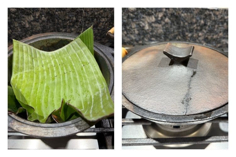 - If you don’t have a clay pot, use a steel bowl or an oven-safe glass dish with a banana leaf lining.