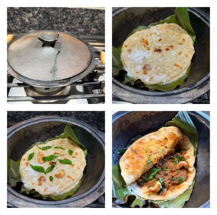 After placing one parotta and pouring coconut milk, add ¼ to ½ cup hot mushroom salna, then layer another parotta over it. Pour a little more thick coconut milk on top, sprinkle ghee-roasted cashews and curry leaves, cover with a piece of banana leaf.