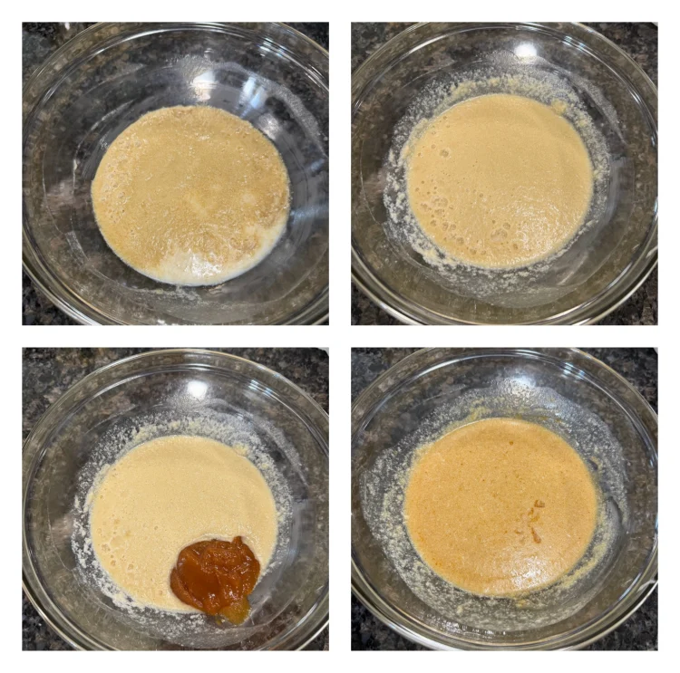 Pour in milk and whisk again. Then stir in pumpkin butter until the mixture turns golden and silky.