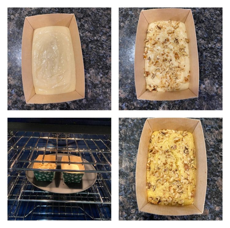 Grease baking loaf pan with a teaspoon of butter. Pour batter into loaf molds, sprinkle chopped walnuts, and bake until golden and fragrant. - Cool, Slice u0026 Serve