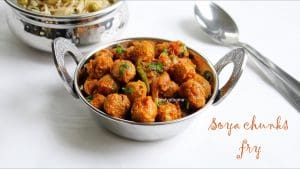 - When tomatoes are soft enough add cooked soya chunks and ¼ cup water mix well. Allow the soya chunks to coat in masala well. When everything looks combined and garnish it with chopped coriander leaves. Serve it hot with pulao, chapati or roti!