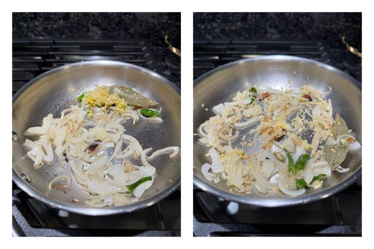 Heat ghee + oil in a heavy-bottom biryani pot/ pan. Add whole spices and let them crackle. Add sliced onions and sauté till golden brown.