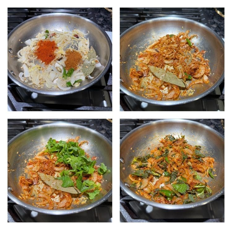 Mix in red chili, turmeric powder, and garam masala. Saute for 30 seconds. Add chopped mint and coriander leaves. Saute.