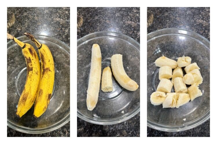 - Heat a non stick pan/ kadai for 5 to 7 minutes. Peel the bananas and chop them into rough pieces.