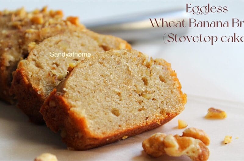 Stovetop Eggless banana bread is a moist, spongy and delicious loaf bread loaded with the flavors of Banana and crunchiness from walnuts. This eggless banana bread is a bit dense as it is prepared with 100% whole wheat flour.