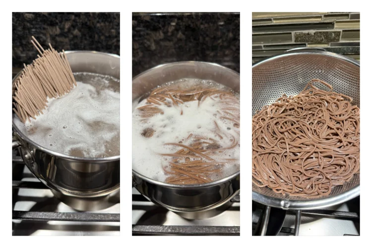 - Don’t overcook: Soba noodles turn mushy fast. 4–5 minutes is perfect; they’ll continue softening slightly after tossing with sauce.